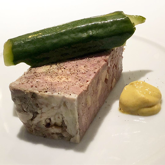 前菜一品目は「江戸前穴子の一皿(穴子とフォワグラ・里芋のテリーヌとナッツをまとった穴子の天火焼き」美しい層の素材が見事なハーモニーを。天火焼きの穴子も食べ応えあり。