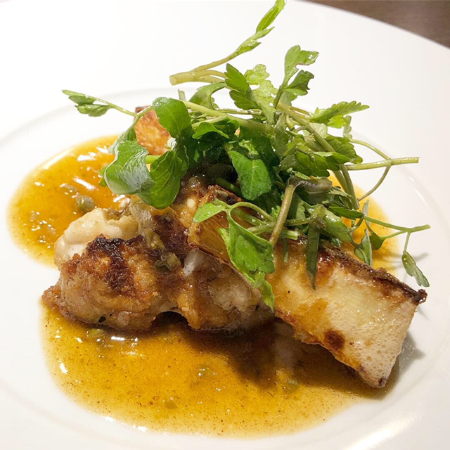 メインはお魚を。「的鯛のポワレ ブールブランソース、牡蠣のムニエル添え」。大振りの牡蠣に的鯛も大きくて食べ応えあり。土台の旬野菜も美味し。