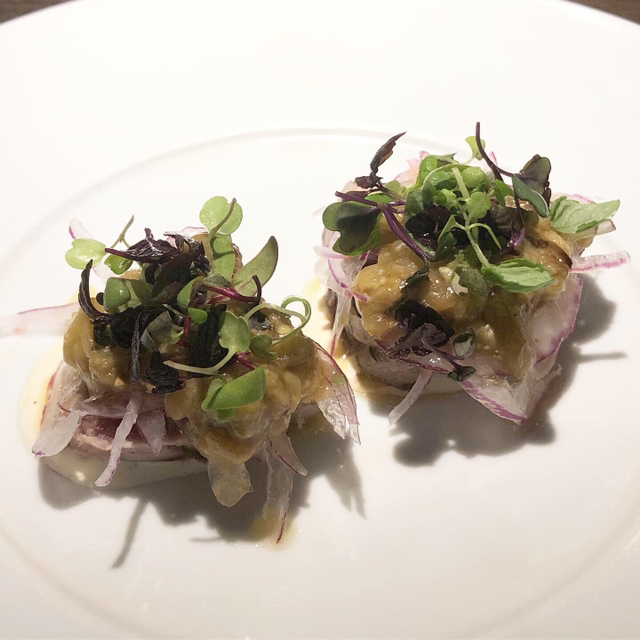 アミューズ「銚子産鰹の炙り」焼き茄子のピュレが乗ってます。
