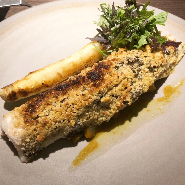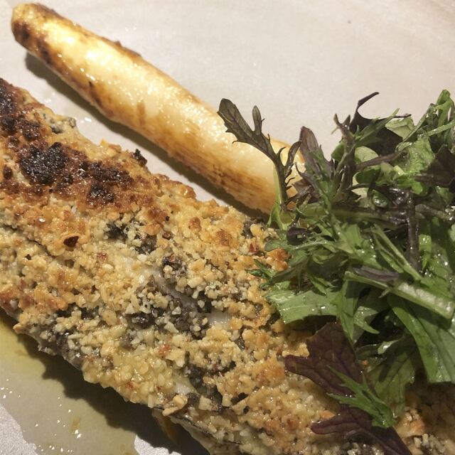 前菜の「ナッツをまとった穴子の天火焼き」が登場。ほのかに香るスパイスがいいですね。