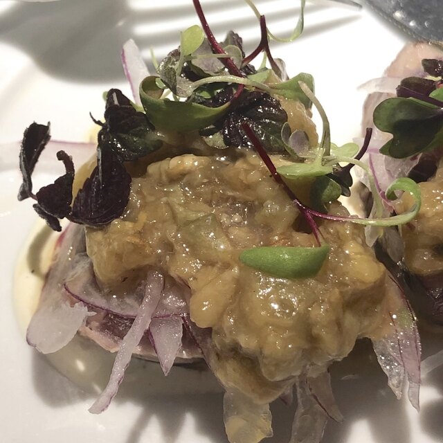 前菜二品目は「北海道知床らうす産ブリの軽いマリネ、焼きナスを添えて」。脂がのったブリが光輝いてます。