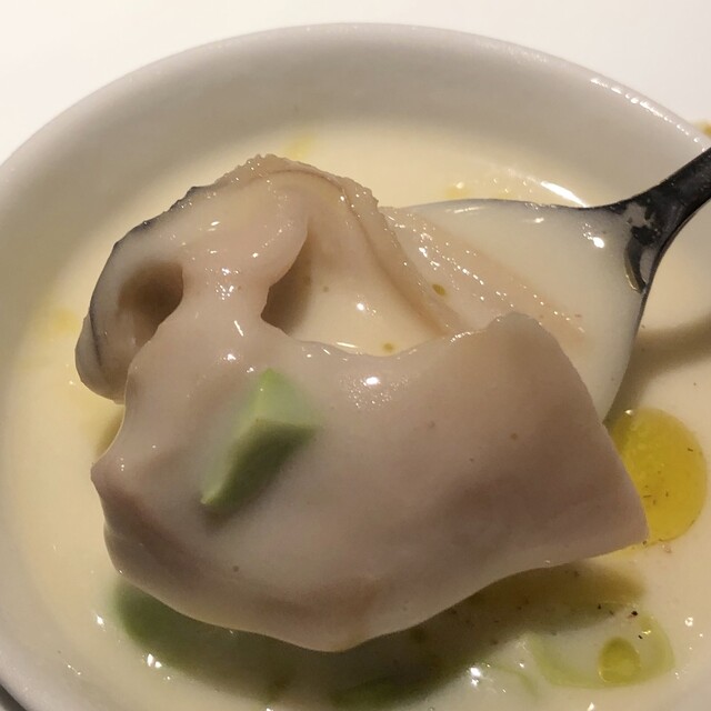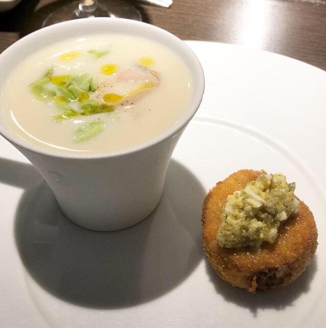 季節の一皿は「ヴィシソワーズ」あさりのお出汁が効いてます。添えてあるのは「豚足・ミミガーのクロケット」。