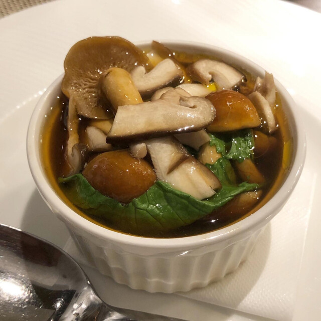 季節の一皿は「きのこたっぷりコンソメスープ」具材の下にはふわふわのフランとフォワグラが