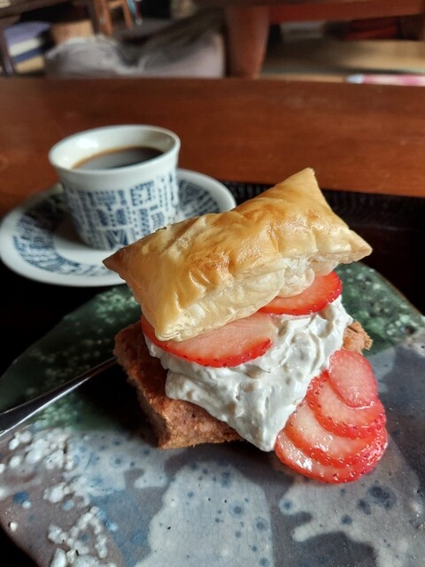 本日のメニューはうろ覚えですが、おからのハンバーグ、筍とフキの煮物、ワカメとほうれん草のゴマソース添え、かぼちゃのスープ、漬物、グレープフルーツのゼリーでした。筍とフキの煮物は大好物です。以前一緒に来た娘に食事の写真を送ったところ、「前回にも増しておいしそう」と返事が来ましたね。色使いもとても鮮やかでおいしくしっかりやさしくいただきました。今日はゆっくりできたのでケーキとコーヒーも初めて追加。なんと大好きなイチゴではありませんか。見た目でまず感動。食べてまた感動。この出会いに感謝するほどでした。