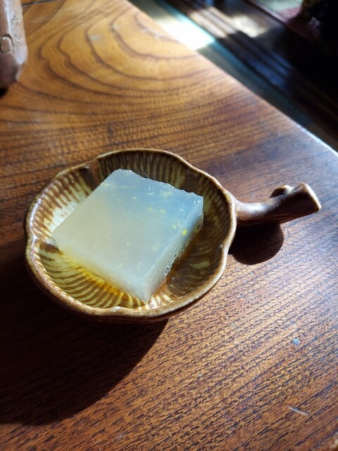 あと里芋の茎の酢の物?大根の輪切り汁、小さなカブの漬物、白菜と油揚げのロール煮物、デザートはゆずの寒天でした。間違っていたらすみません。