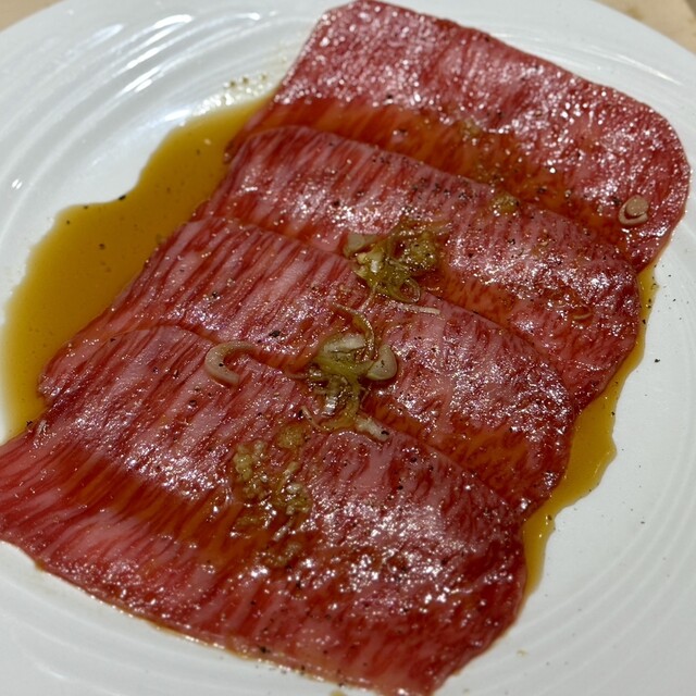 タンは2個体を食べ比べ。レモンなどはつけずにそのむまでいただきました。素材がいいので、シンプルな味付けでも旨味がしっかり感じられて美味しかったです。ブルスケッタは、ぶつ切りのゆっけをガーリックバターの染みこんだパンに乗せていただくんですが、これが超絶品!お肉のカットはこれくらい大きいほうがしっかり食べた感じして好き♡
