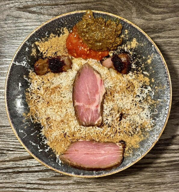 リンゴ酢と2種のオリーブオイルに自家製パンチェッタ添え