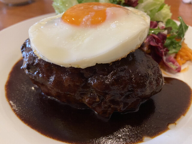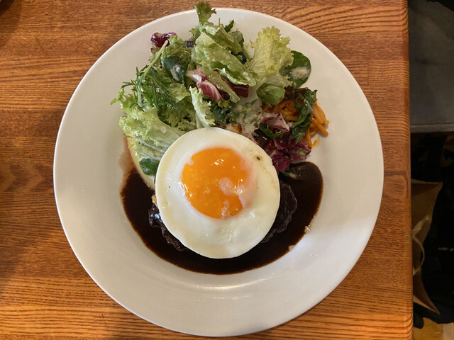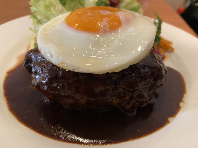 後半は目玉焼きとデミグラスソースを混ぜてハンバーグの上へ。