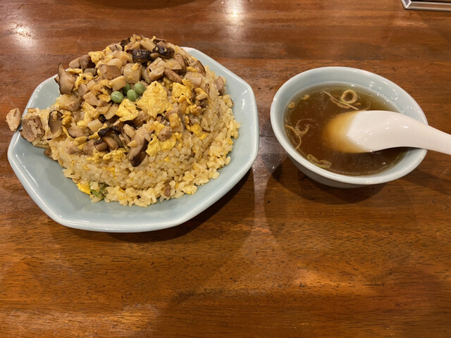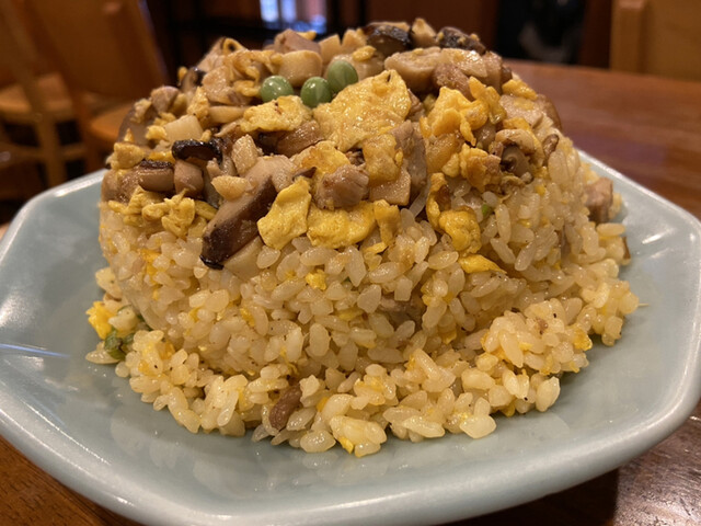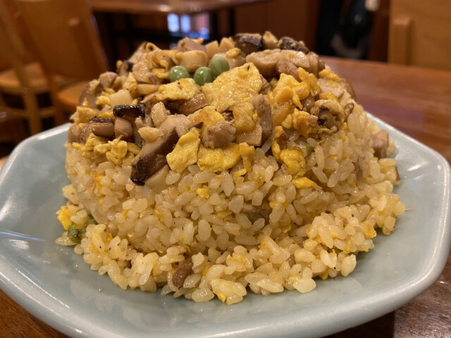 五目チャーハンはチャーシュー、玉子、しいたけ、たけのこ、ネギ、グリーンピースは乗っています。