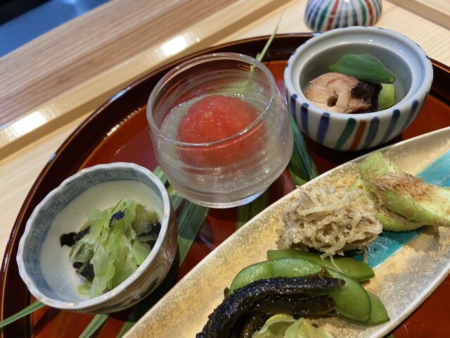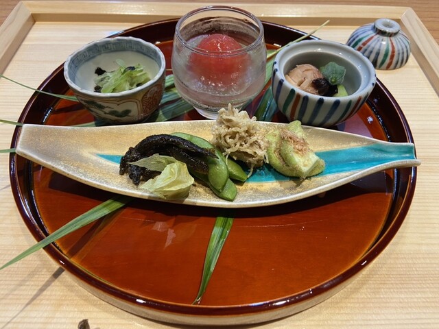 ・前菜 手芋のすり流し、蓮子鯛棒寿司、鮎甘露煮、かきのもと胡麻和え