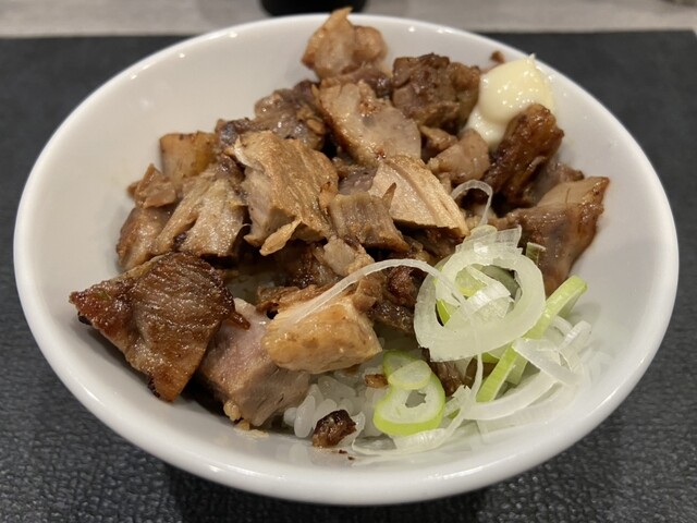チャーシュー飯は角切りチャーシューとネギ、少しだけマヨが添えてあります。