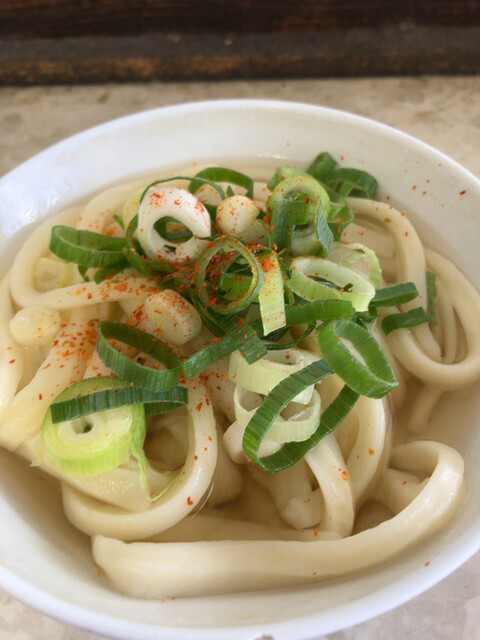 温かいのか冷たいのを選択して自分で出汁、天ぷら、薬味を乗せて会計へ小うどんに出汁、薬味にネギで