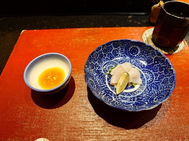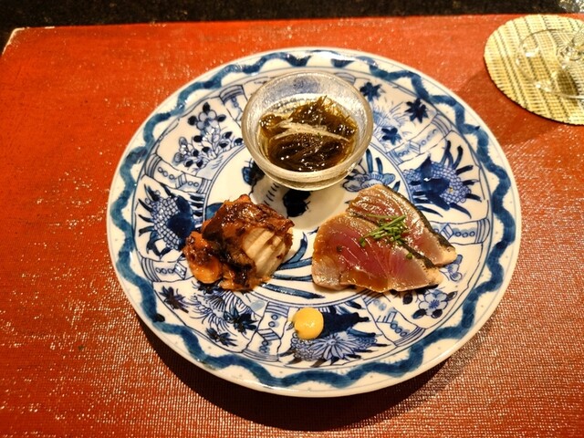 ▶おまかせ寿司割烹「琵琶」 の内容 □□料理□□ ▷最初の皿 ◯アカイカの醤油漬け ◯タコの柔らか煮 ◯鰹のタタキ