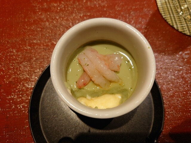 ◯大葉と甘えびの冷製茶碗蒸し 福井県で採れた甘海老 冷たい茶碗蒸しとなり 上に大葉の茶碗蒸し 下に鰹出汁だけのプレーンの茶碗蒸し の2層となっている これも前回出ている茶碗蒸しとなる
