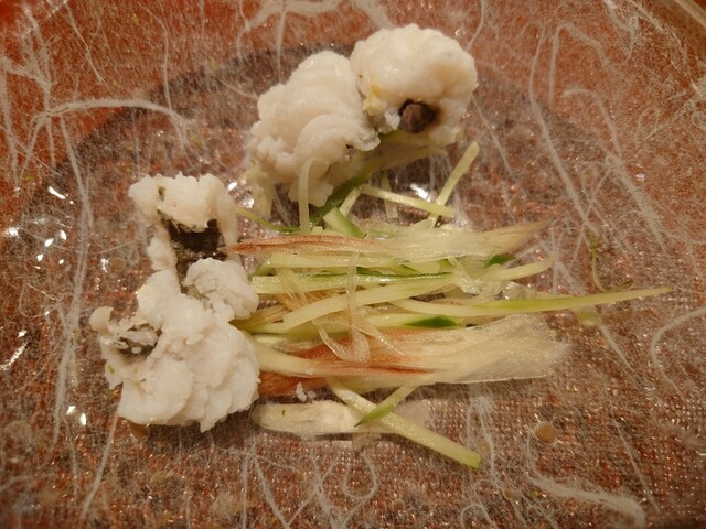 ◯蝦夷鮑 江戸前の煮鮑の要領で 20杯くらい纏めて一緒に水、酒、塩だけで炊かれている 肝は酒蒸しした品が上に載せてある とのこと 毎回このお店で出てくる 定番の品(スペシャリテ)となる
