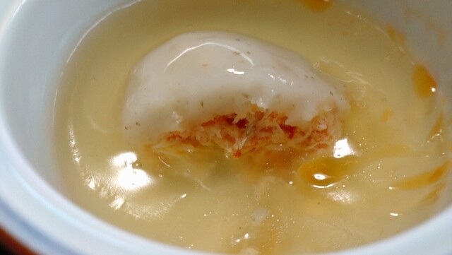 外は白い皮となり 中にはほんのりと枝豆の味わいのする皮の層がある ラー油に見える液体は蟹のエキスとなる