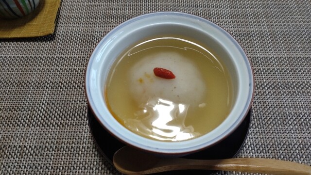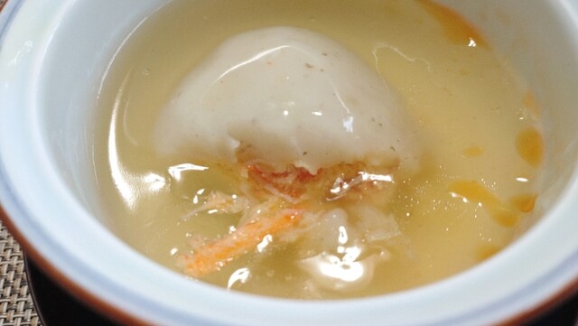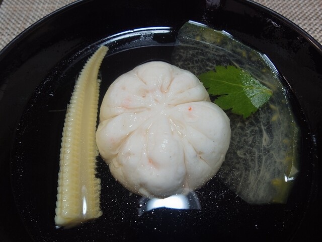 出汁汁も適度な塩味と節、魚のアラの旨味感で お上品な味わいがしていて美味しい 上には薄切りの冬瓜にヤングコーンが載せられていて 季節感も感じる