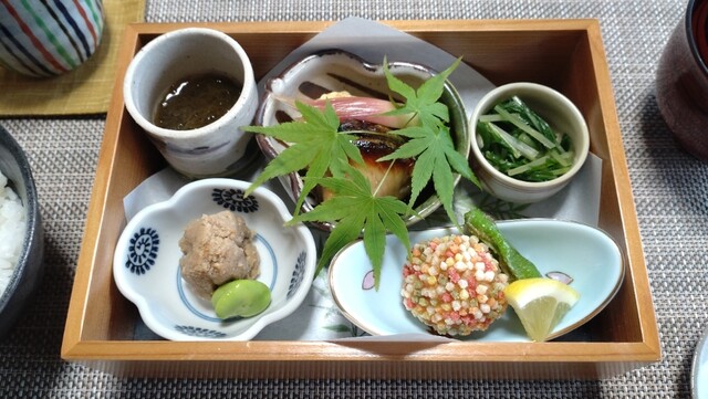 ◯銀鮭の塩焼き 鮭の脂乗りも良い感じで、ご飯によく合う ◯だし焼き玉子 適度な甘みと塩のバランスが好みな味わいだなあ ◯ミョウガの酢漬け これも季節感を感じる ◯さつまいもの蜜煮