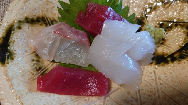 ◯お造り 鮪、イカ、鯛 となる イカには隠し包丁が入れられており とろみ感ある美味しさ
