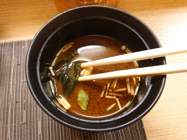 ◯岩もずくのお味噌汁 能登の方で上がる少し変わったもずくを入れている との説明 もずくのシャリシャリとした小気味良い食感と