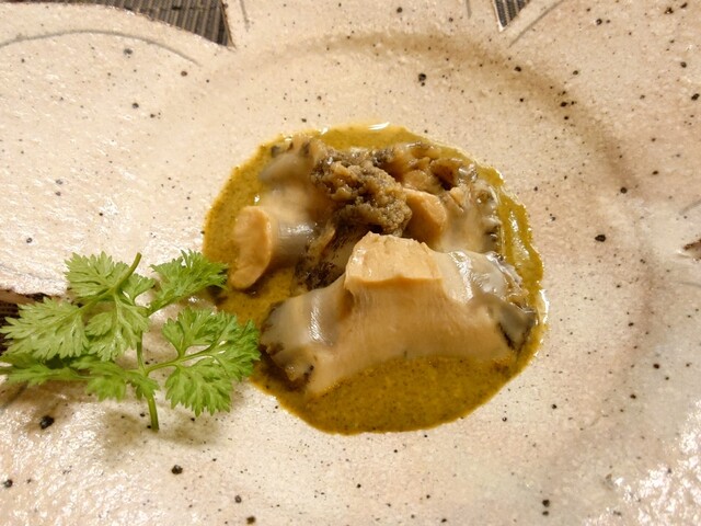 鮑はクニッと食感で柔らかく煮られていて 肝のソースの磯の味わいほんのり苦味と旨味感がジンワリ 軽く塩味がしていて美味しいなあ♪ 肝ソースに生クリームが入れてあり 肝の苦手な方も食べやすくしてある