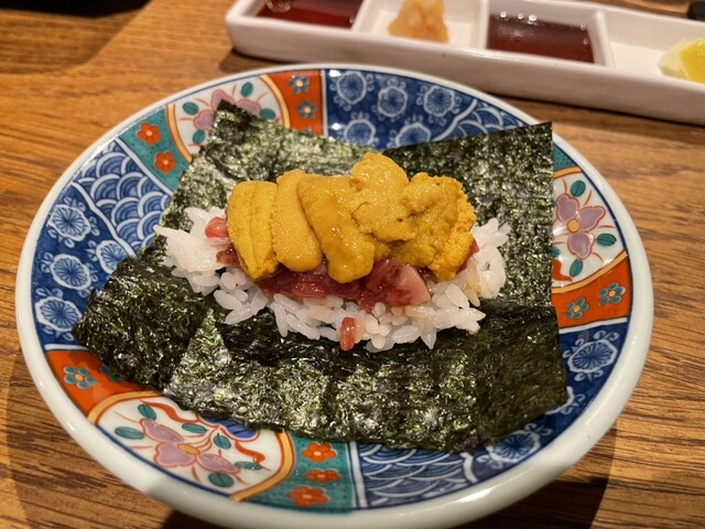 ご飯ものも握りや巻物、最後は肉に合うよう味付けしたイクラ丼も出てきて、お腹いっぱい食べさせてもらいました。
