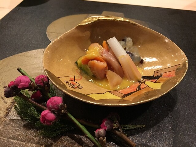 (平貝、春野菜、帆立の肝、赤水菜、山葵菜、スナップエンドウ、こごみ、筍など)