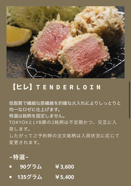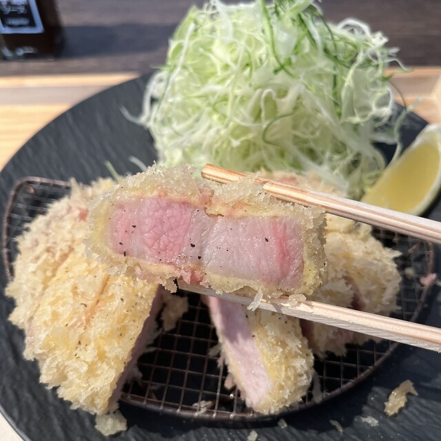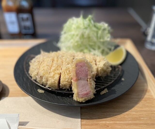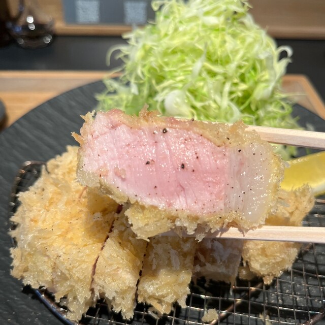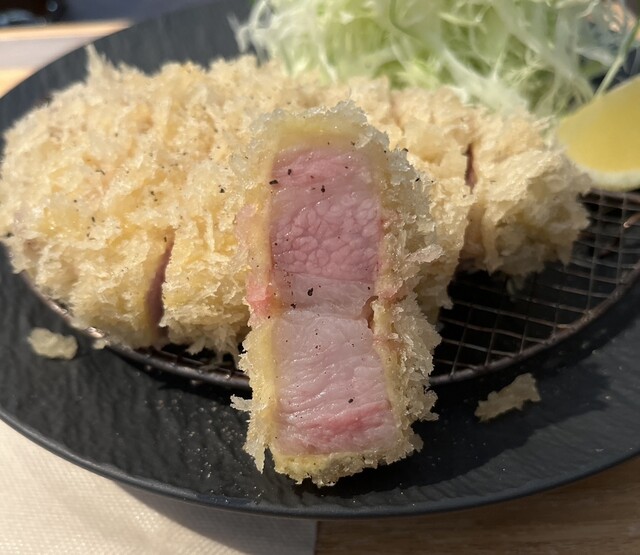 白い衣に薄ピンクの綺麗な見た目で断面は赤身と脂身のバランスがとてもいいです。歯切れがよく、肉の水分量、火入れ加減とどれも完璧です。脂は口に入れるとジュワっと溶けます。調味料もソース2種類(完熟、中濃)、塩、醤油、わさび、レモンと豊富でどれで食べても美味しいです。ロースなのにくどくないのが不思議です。