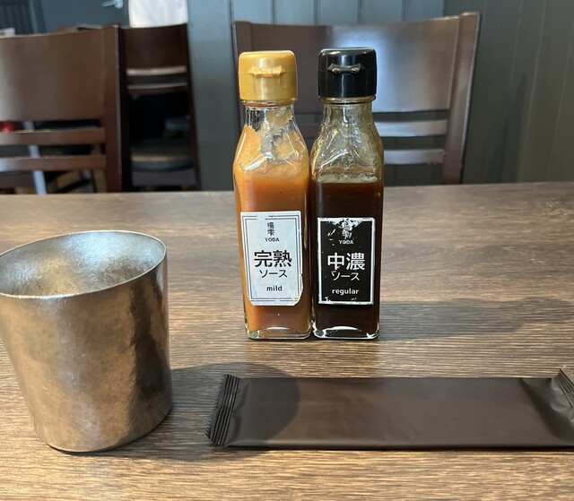 ソースは中濃、完熟と2種類あり、完熟の方がさっぱりとした味わいでした。個人的にはソースより添え付けのわさび塩でいただくのがおすすめです。