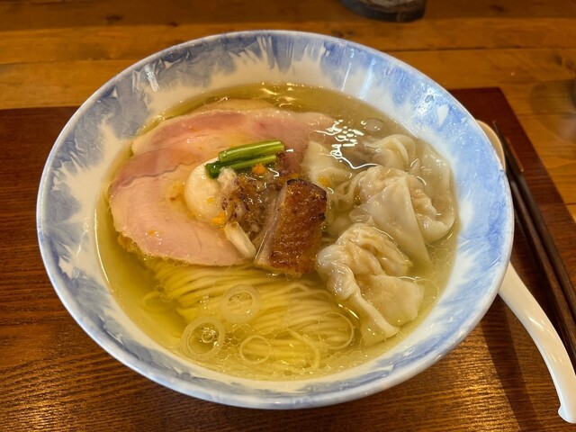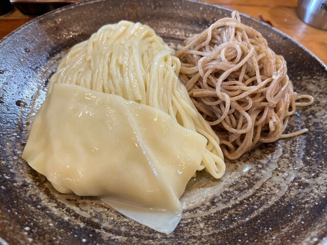 麺が2種類に麺の刺身も付いてきます。麺の刺身はふきのとうのオイル漬けに塩がかかっており、ふきのとうの苦味と相性が良くてとても美味しいです。2種の麺は白い方が国産小麦の中心部を使用しており、滑らかで柔らかいです。蕎麦のような麺は小麦の外皮付近を使用しているようで、少し粒感のある口当たりに穀物のいい香りがします。どちらも美味しかったです。