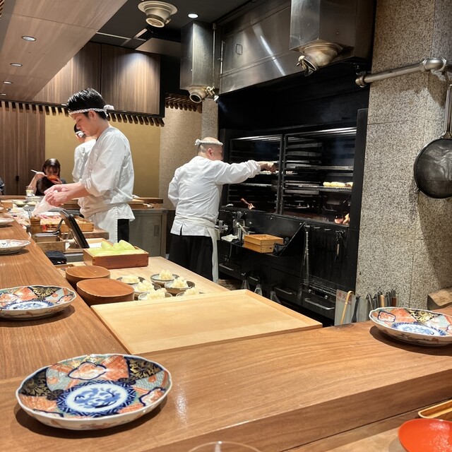 店内は12席程のコの字カウンターで、厨房の奥には薪の焼き台があります。置かれているお皿がとてもお洒落でした。