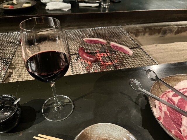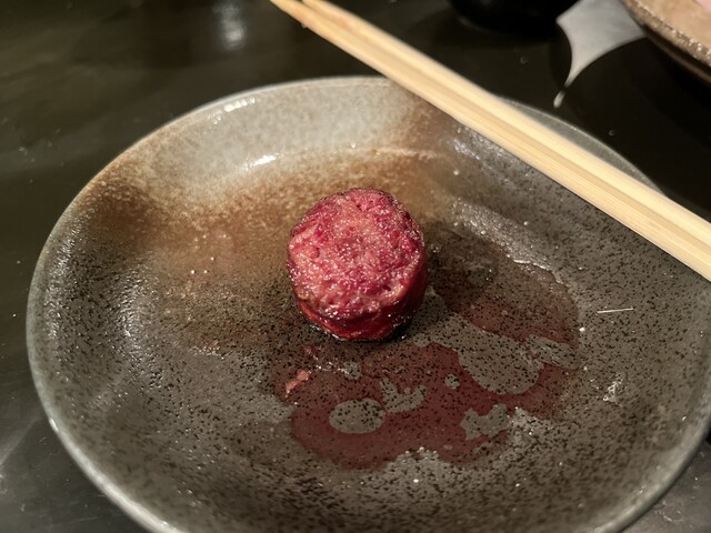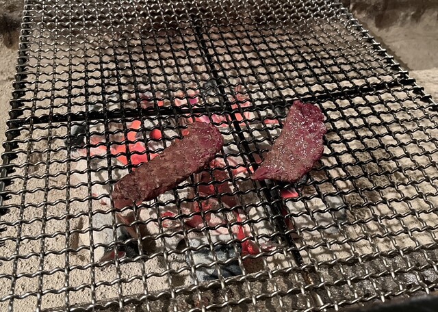 熊は時間をかけてじっくりと焼きます。店員さんが焼き加減を指示してくれるので、時々ひっくり返す作業だけ自分達で行います。あらかた焼けたら、6等分くらいに切って断面を焼きます。熊はジビエの中でも癖が強いと聞いてたので、恐る恐るでしたが、食べてみると全く臭くない。肉々しい感じでとても美味しかったです。他の味で例えるのも変ですが、サラミに近い感じでした。