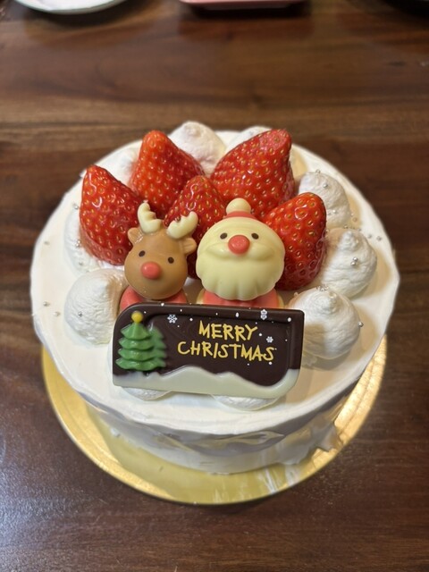 儀式後、入刀。プレート、板チョコすべて外し切り分け。いちごも多くランダムに置かれ、悪戦苦闘するもなんとか分割終了。