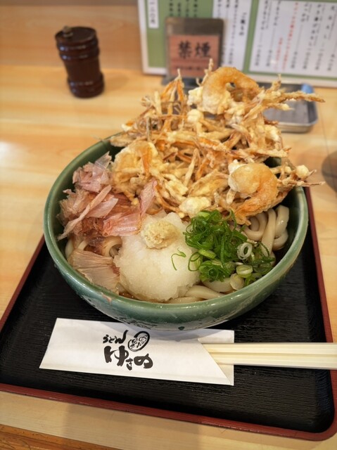 ごぼうとにんじんと海老のおっきなかき揚げがのったうどんが到着◎