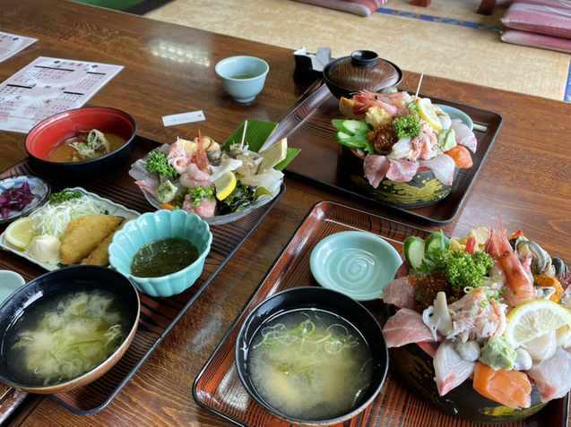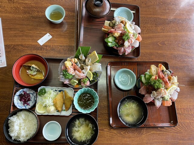 海鮮丼はお勧め頂いた通りたっぷりの魚介で溢れんばかり!お刺身定食も刺身もフライも煮魚もと満足!