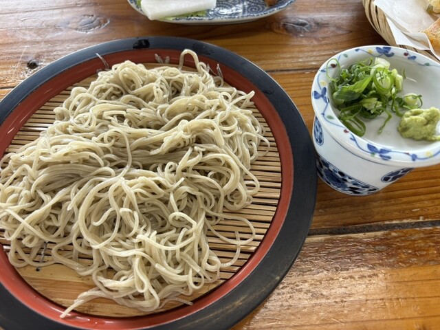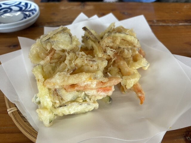 ざる蕎麦いただきました!あとは、かき揚げのハーフ、私はざる蕎麦で妻は野菜蕎麦を注文、景色は最高だし、空気もうまいし、かき揚げハーフも美味しい!お腹いっぱいになりました!
