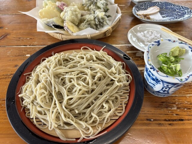 ざる蕎麦&天ぷら最高コンビです!お野菜いっぱいの天ぷらはサックサクでそのままいくも良し!塩でサクッといくも良し!美味しかったです!ざる蕎麦は文句なしの旨さ!天ぷら〜ざる蕎麦〜天ぷらとコンビネーションで食べるとなお最高!お腹大満足です!景色も最高です!