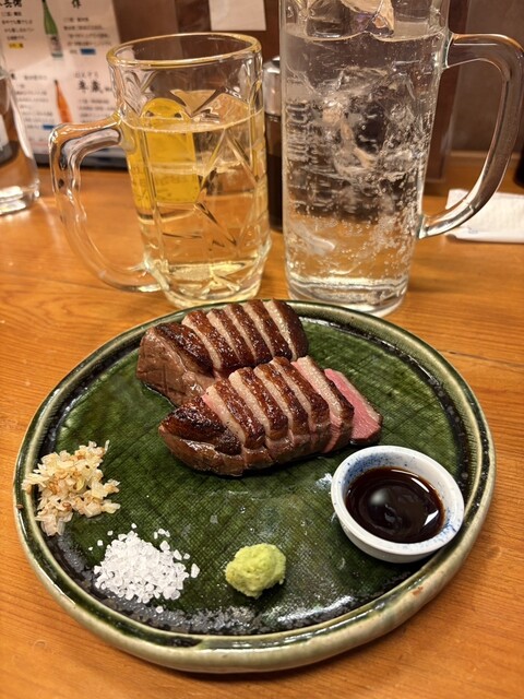 ・鴨ロースはパートナーの1番のおすすめ!粗塩、わさび、ねぎ、タレで味変が楽しめる。1/2にすれば良かったねと話していたものの結局すぐになくなりました!笑 弾力があるのに柔らかく、鴨自体の味もしっかり楽しめる上品な味、、ねぎは少量でも大分パンチが感じられる。