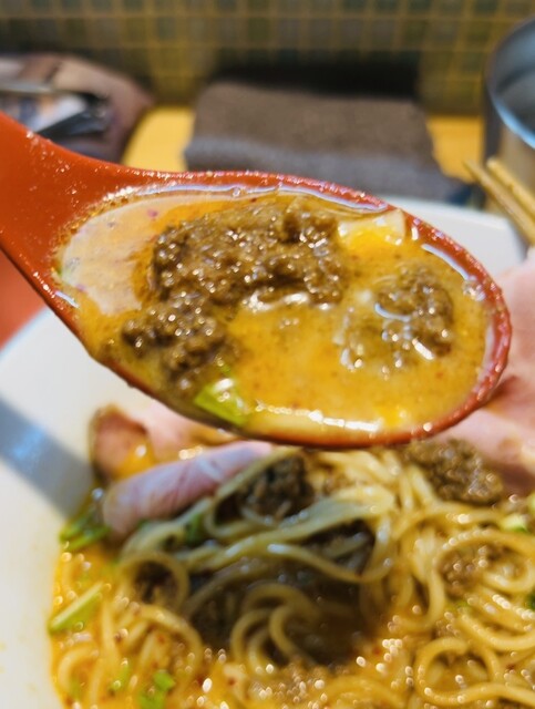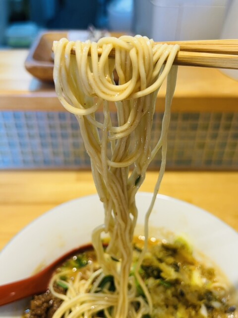 スープは…一口目はライトな感じの胡麻香るなかに、辣油が廻し入れられています。