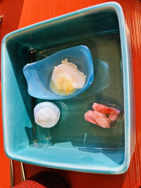□水菓子 冬苺の水晶羹、抹茶雪見団子、酒粕とマスカルポーネチーズのババロア