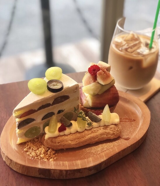 3種のぶどうのショートケーキ、ぶどうのエクレア、いちじくのもりもりタルト、アイスオレ