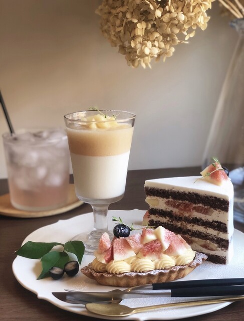 いちじくのショートケーキ、いちじくのバルケット、桃のブランマンジェ、自家製季節の果実シロップ(桃 炭酸割り)