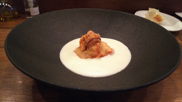 -スープ スープに、穴子フリットとうにがオンしていました。贅沢の極みです。