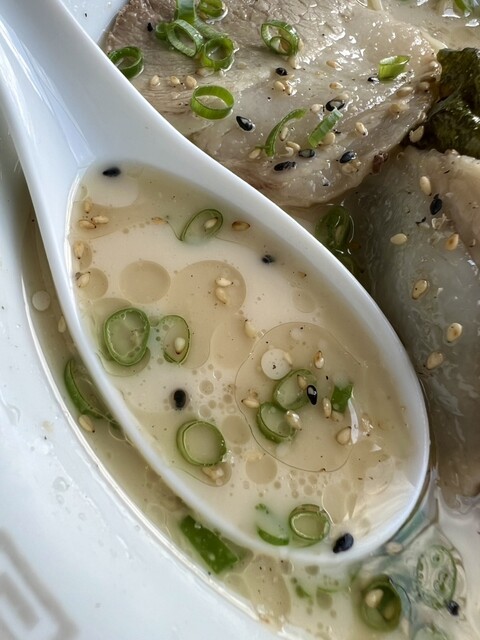看板メニューの豚骨ラーメンはクリーミーながらさらさらしていて、独特な豚骨臭さはなくあっという間に食べ終わりました。チャーシューは若干のパサパサ感ありましたが、気にならない程度。
