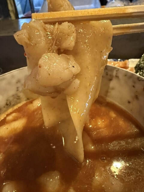 花山うどんで人気の群馬郷土麺の鬼ひも川を彷彿させるラーメンヴァージョンかとも思える太さ、いやそれ以上か