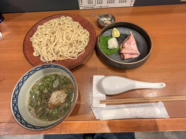 (冬限定) 背脂煮干しつけ麺、ワンタン入り、ローストポーク丼