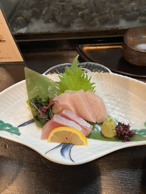 お造りはカンパチ・タコぶつ・アオリイカを。野菜は長芋の鉄板焼き。それにお連れ様がブリカマ?とにかく何かの魚のカマを注文しました。