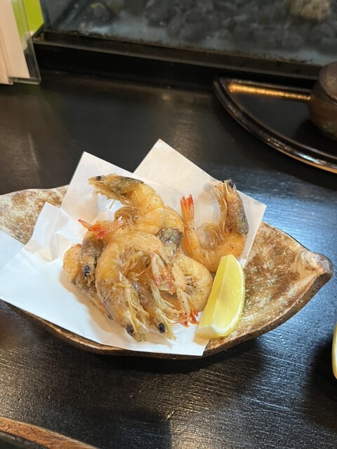 本日は軽めに、正統派に鯛とイカのお造りと甘海老の唐揚げをいただきます。