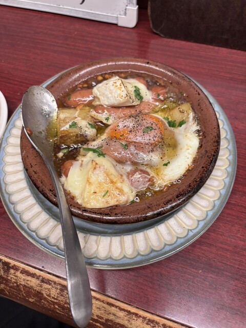 ソーセージ、チーズ、卵とスペイン風の組み合わせは鉄板でありながら、案外アヒージョとして出すお店って珍しいです❗️