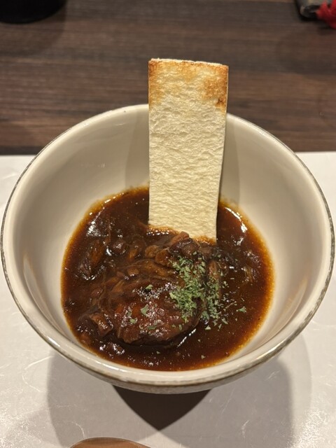 ビーフシチュー、前回はクラッカーでしたが、今回は薄切りバゲットが添えられてます。